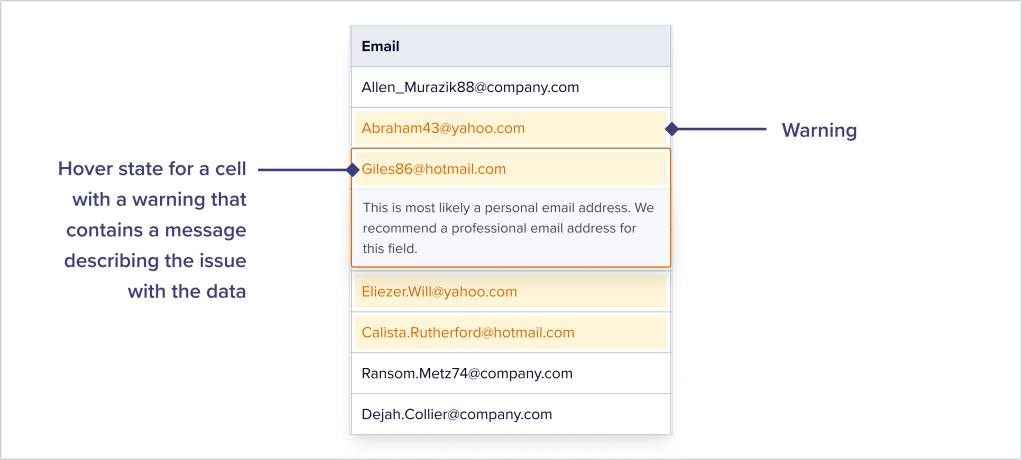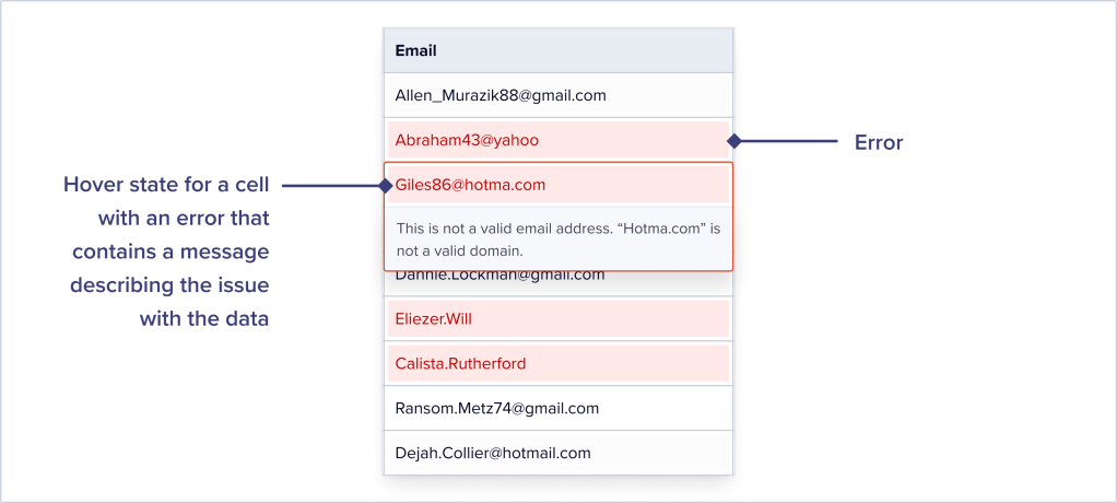 Errors are highlighted in red and accompanied by configurable error messages that describe what’s wrong. The example below shows what a user sees when they hover over a cell with an error on it: