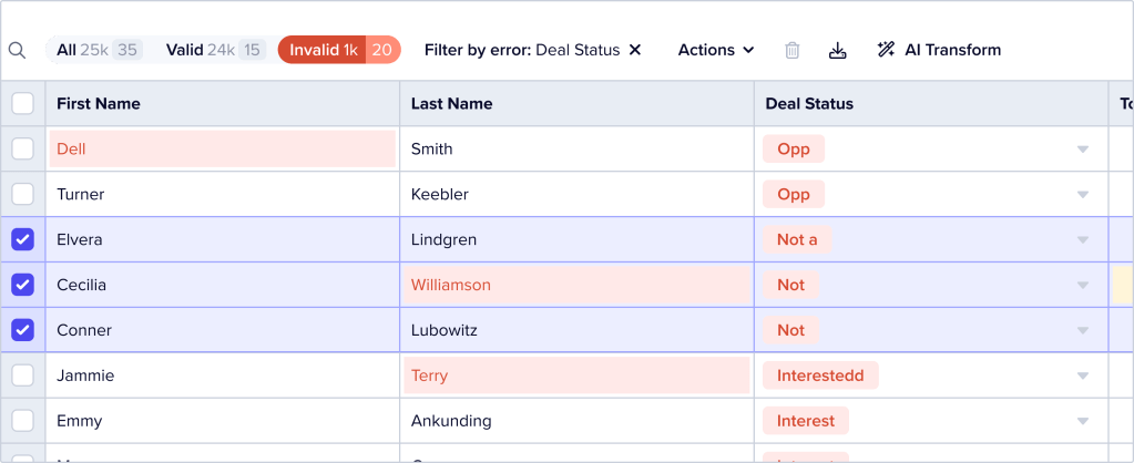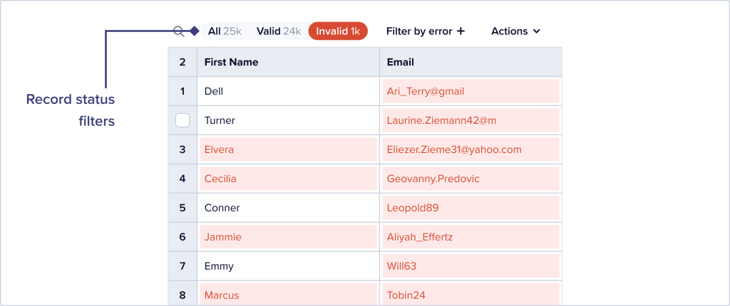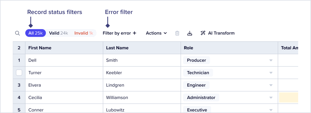 Flatfile offers multiple ways in which a user can slice and dice data via the record Status quick filter, filter by error feature and FFQL. Users can select all data using our checkbox UI by clicking on the checkbox on the top left of the table, or more granularly select data by individually checking boxes.