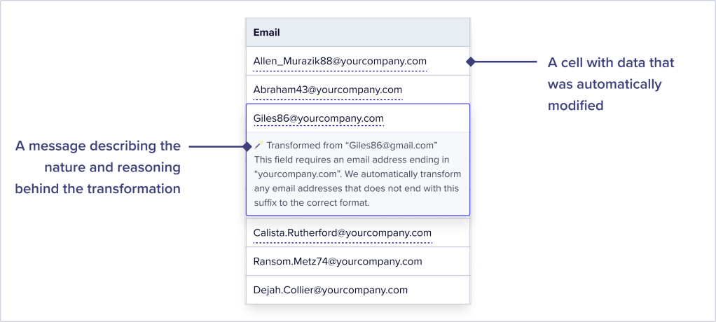 Another way our customers make data review and correction easy for their end users is by deploying custom logic that automatically transforms incoming data to correct it using Record Hooks. But it’s really important for end user to be able to see what data was automatically transformed, so they can correct it if the automated transformation was insufficient in some way. We encourage our customer to configure Record Hooks with a short description of how and why data was transformed.