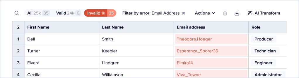 After transforming the data the end user can review and correct any errors they see (e.g. guests with invalid emails or similar). Turntable – the topic of this blog post – is the user interface provided by Flatfile for data review and error resolution.
