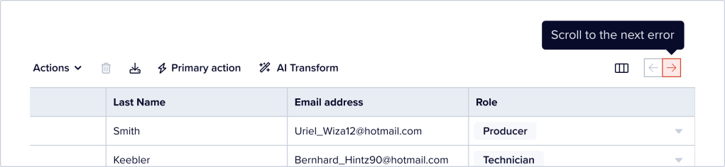 Sometime the cells that errors on them aren’t on screen. User can click on the “scroll to next error” button to the top right of the table to horizontally scroll to the next column that has records with error in them.