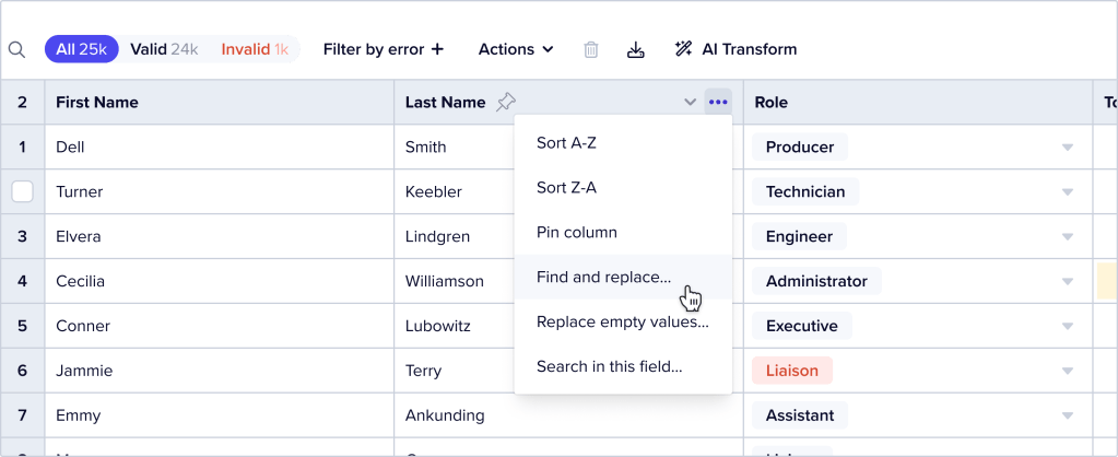 Flatfile offers a few out of the box features for bulk resolution of common errors – find and replace and replace empty values. You can find this functionality by clicking on the column context menu – a three dot icon that appears when you hover over a column header: