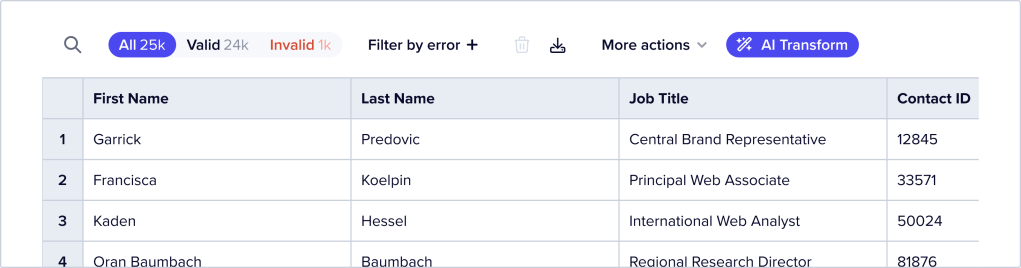 Users can also use Flatfile’s AI Transform feature and to describe how they’d like their data transformed using natural language. Flatfile takes this prompt and generates and executes the code necessary to make the desired changes instantly across the entire data set.