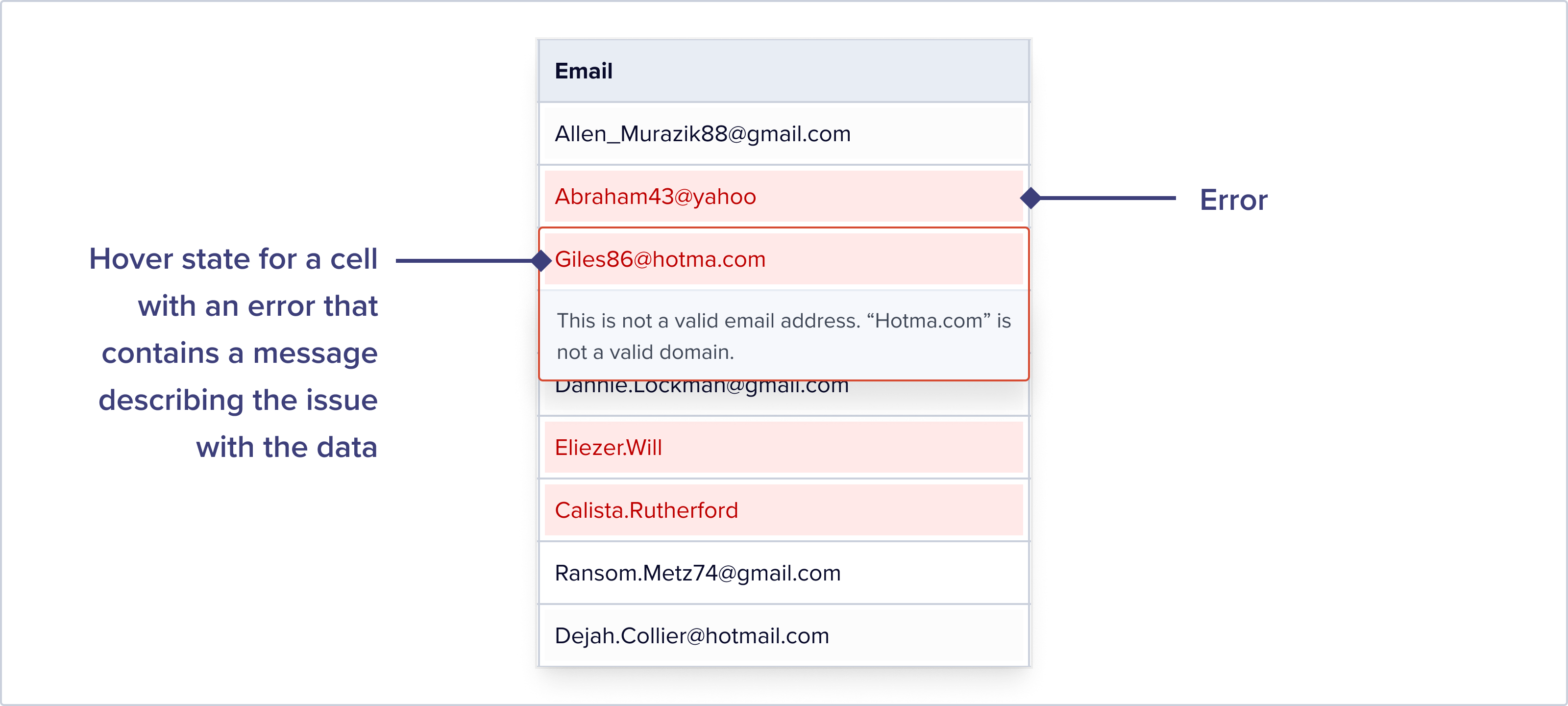 Errors are highlighted in red and accompanied by configurable error messages that describe what’s wrong. The example below shows what a user sees when they hover over a cell with an error on it: