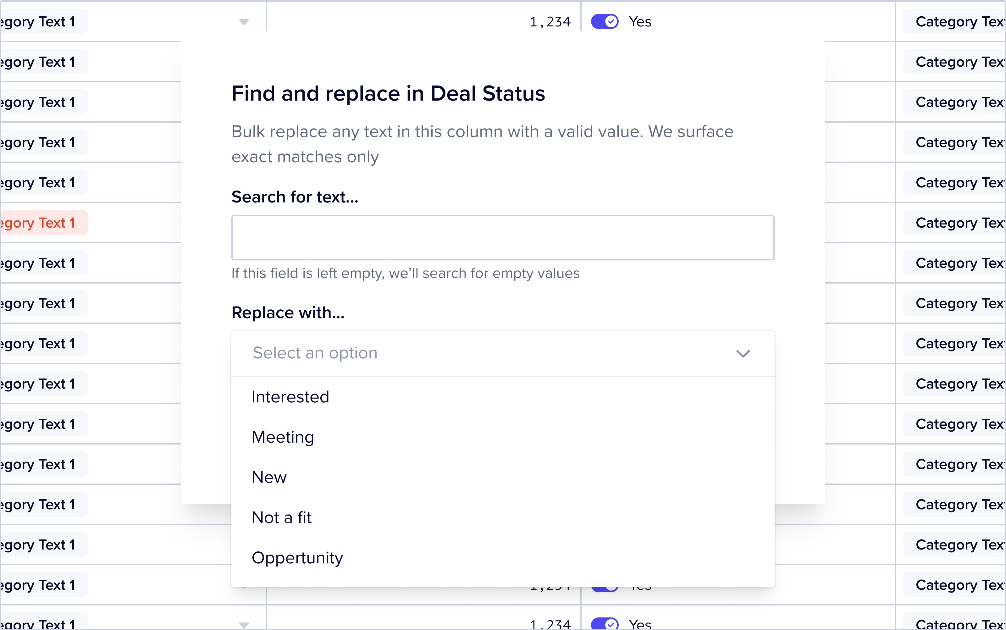 Here is an example of the available “replace” options in a find and replace triggered from a field named “Deal Status” for which the encoded valid options in the Blueprint are “Interested”, “Meeting”, “New”, “Not a fit” and “Opportunity”: