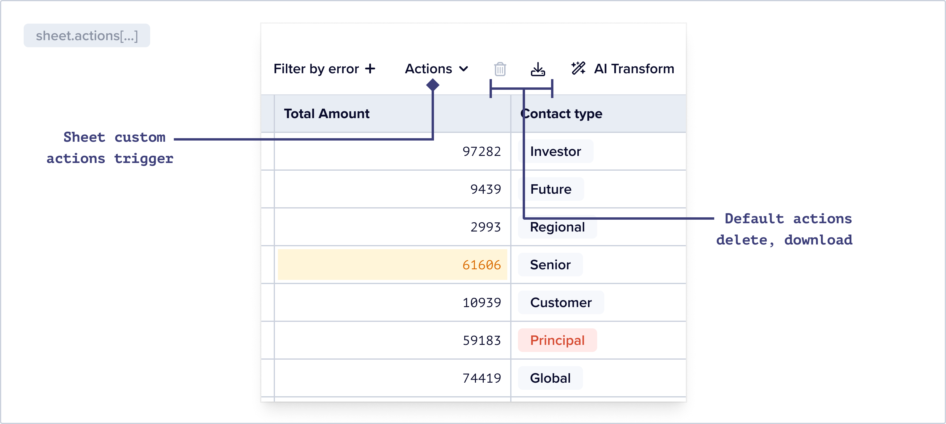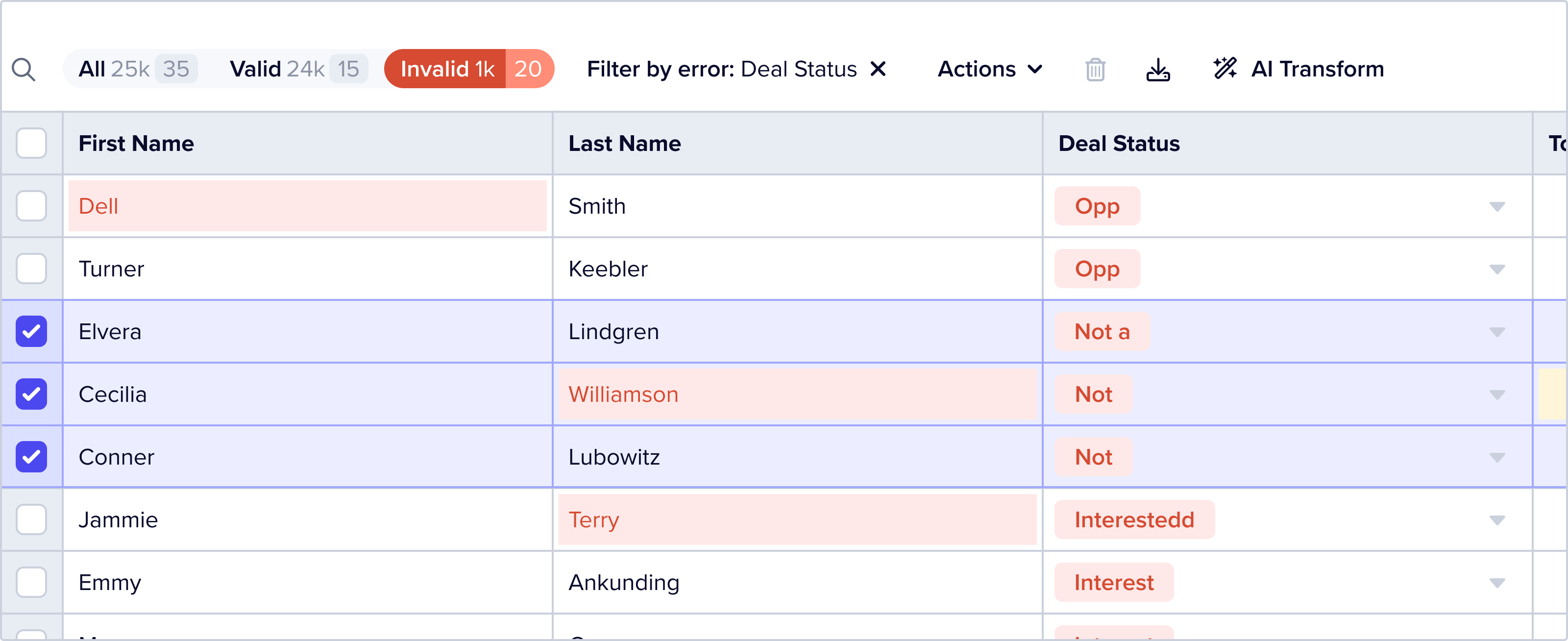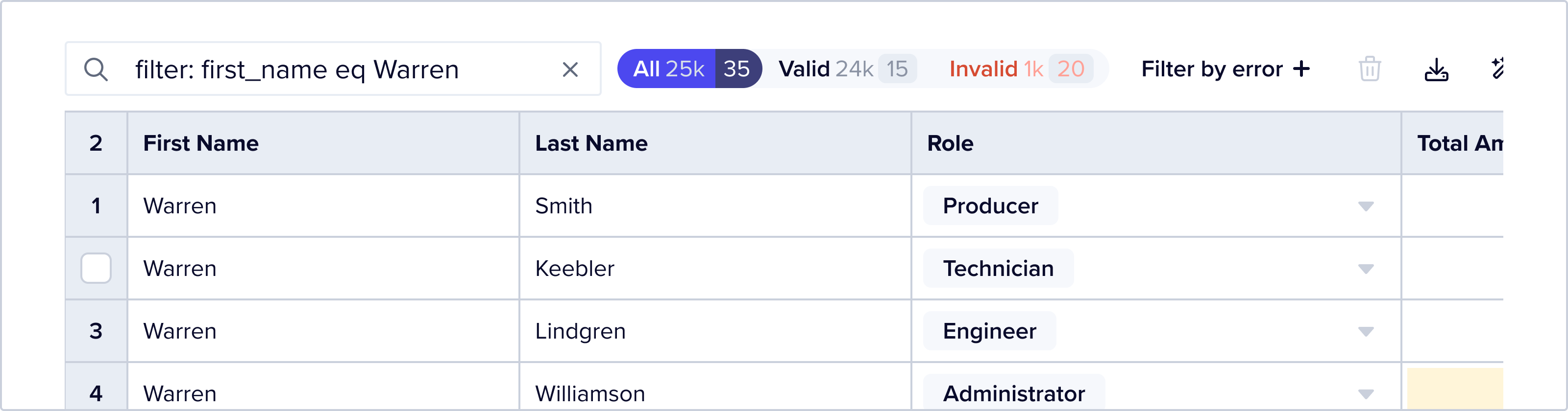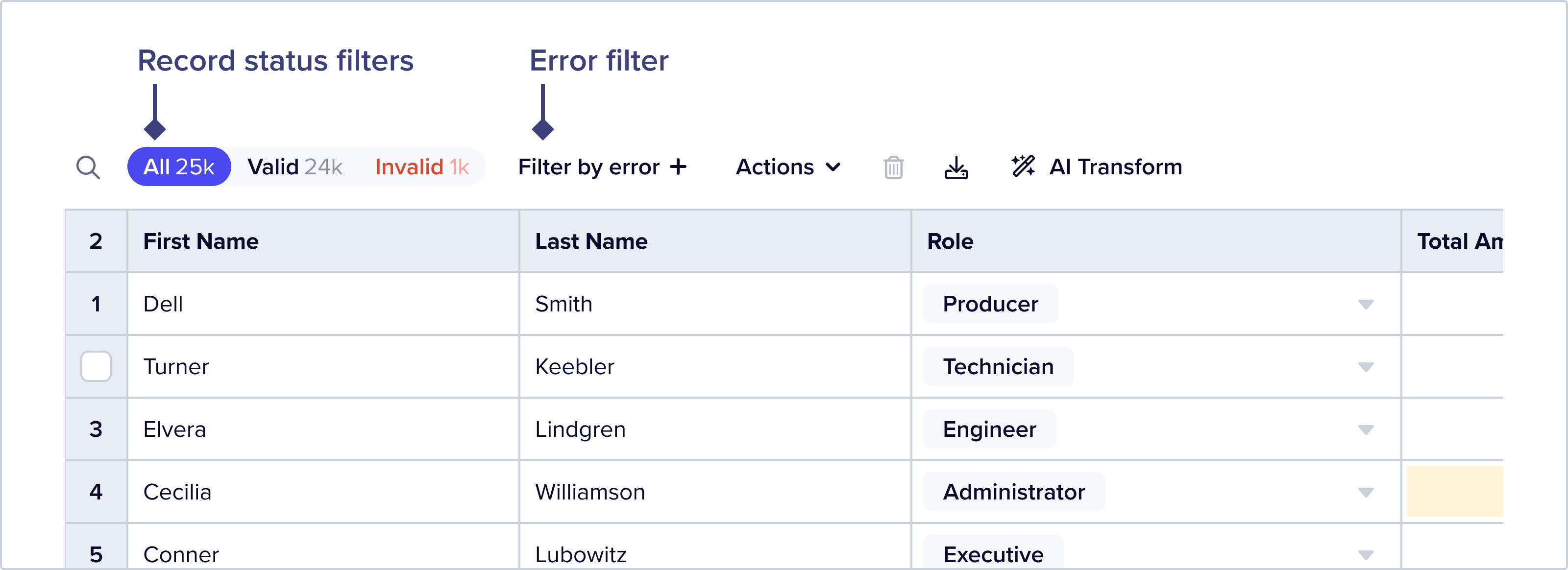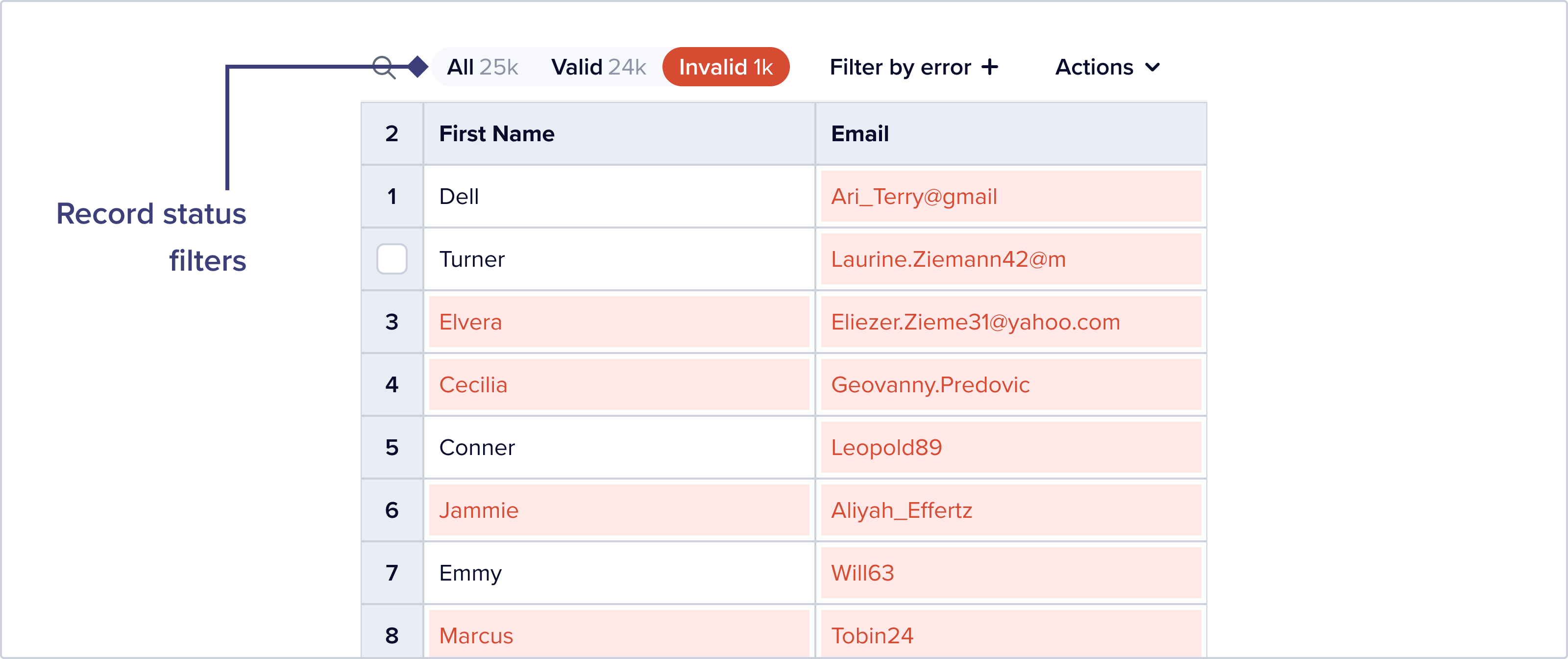 Flatfile offers multiple ways in which a user can slice and dice data via the record Status quick filter, filter by error feature and FFQL. Users can select all data using our checkbox UI by clicking on the checkbox on the top left of the table, or more granularly select data by individually checking boxes.
