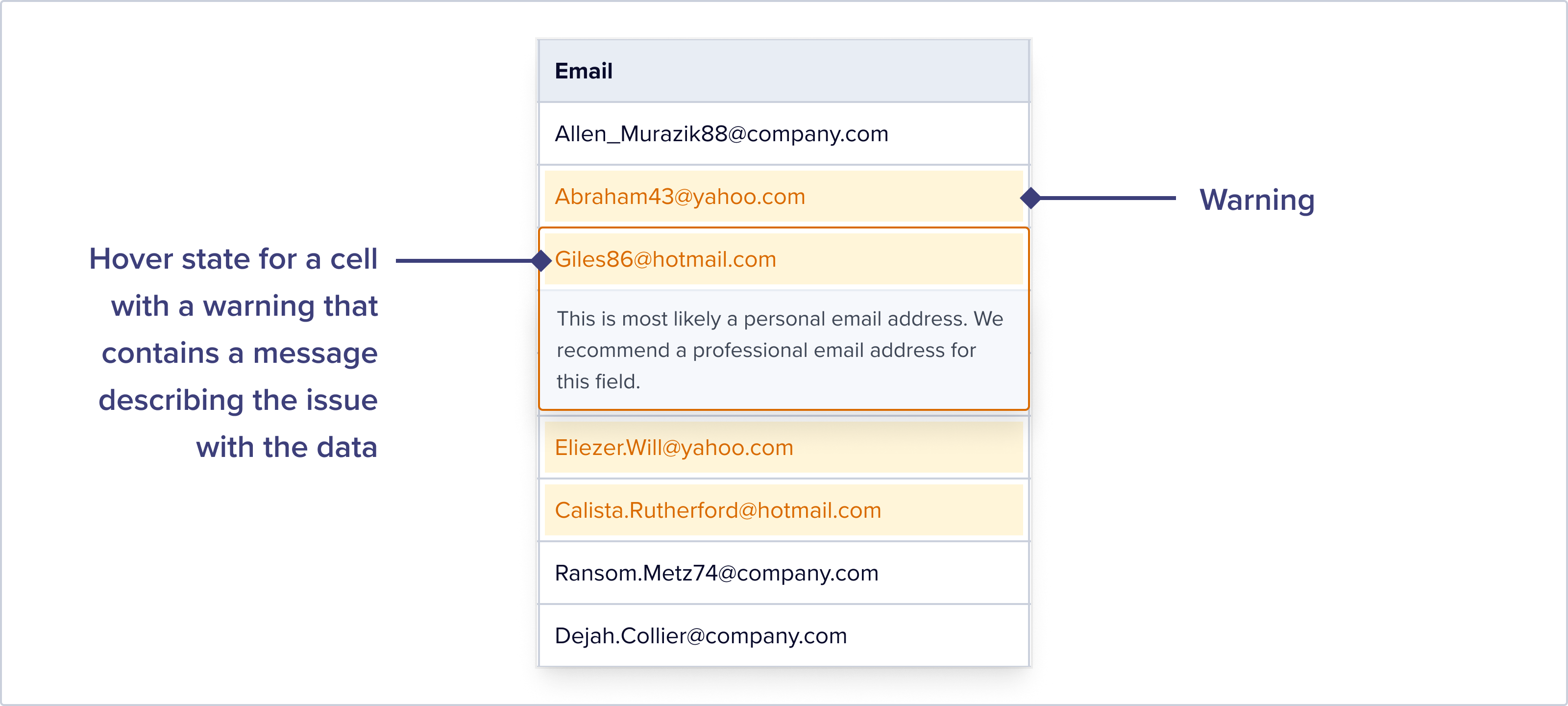 Warnings are highlighted in yellow, and do not show up when you filter the dataset to just show records with errors. It’s best to use Warnings to draw users’ attention to potentially problematic data that is perhaps less important for them to resolve.