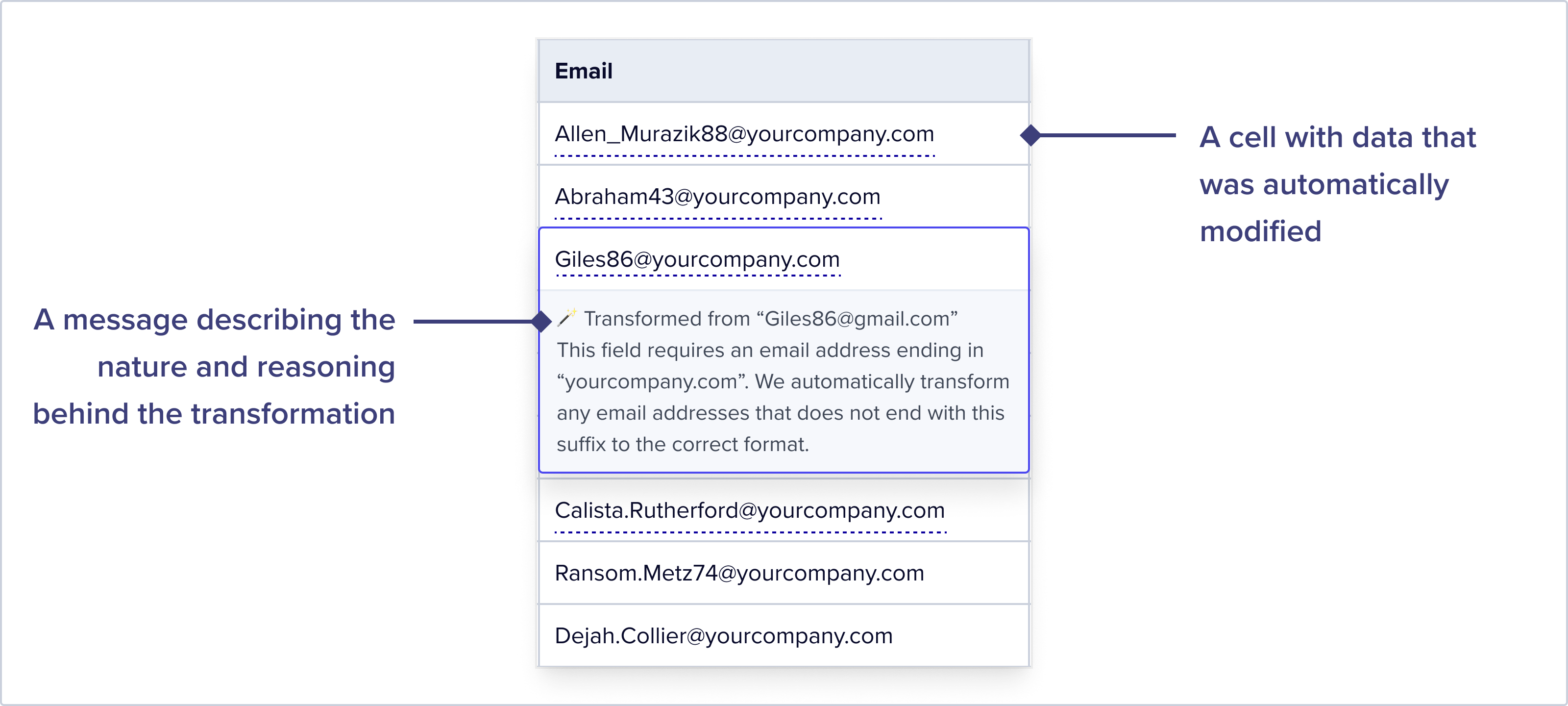 Another way our customers make data review and correction easy for their end users is by deploying custom logic that automatically transforms incoming data to correct it using Record Hooks. But it’s really important for end user to be able to see what data was automatically transformed, so they can correct it if the automated transformation was insufficient in some way. We encourage our customer to configure Record Hooks with a short description of how and why data was transformed.