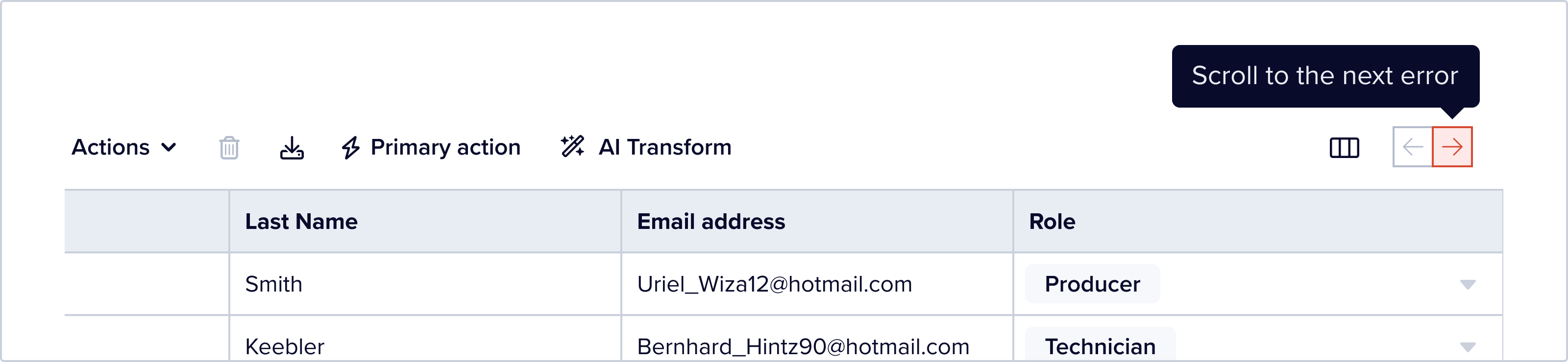 Sometime the cells that errors on them aren’t on screen. User can click on the “scroll to next error” button to the top right of the table to horizontally scroll to the next column that has records with error in them.