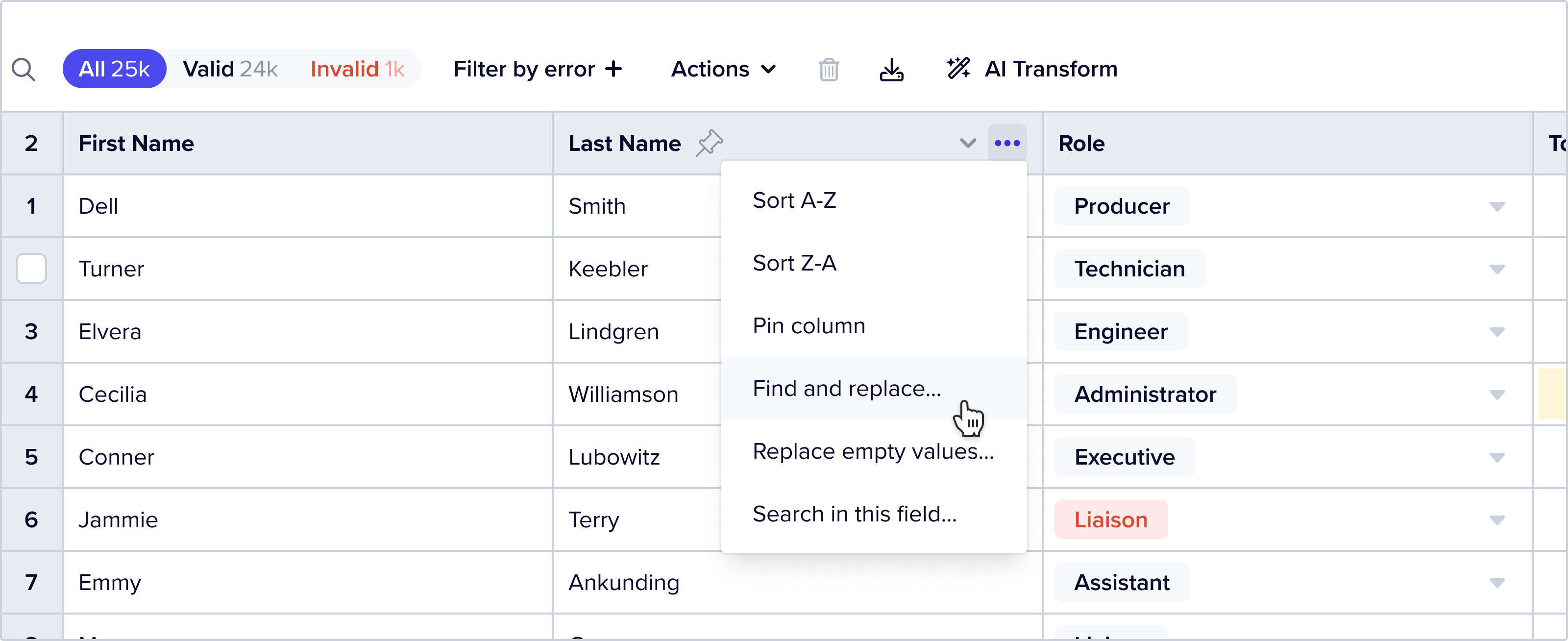 Flatfile offers a few out of the box features for bulk resolution of common errors – find and replace and replace empty values. You can find this functionality by clicking on the column context menu – a three dot icon that appears when you hover over a column header: