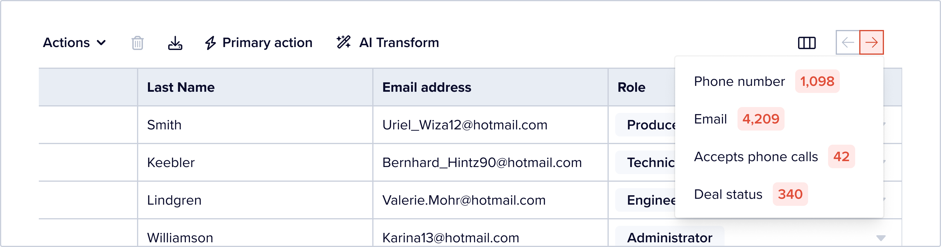 Earlier, I referenced the record status quick filter. This is a quick filter optimized to surface records based on whether they are valid or invalid. This button group shows counts by status – it’s a great way to get a high level of view of the dataset. This makes it really easy for end users to find dirty data.