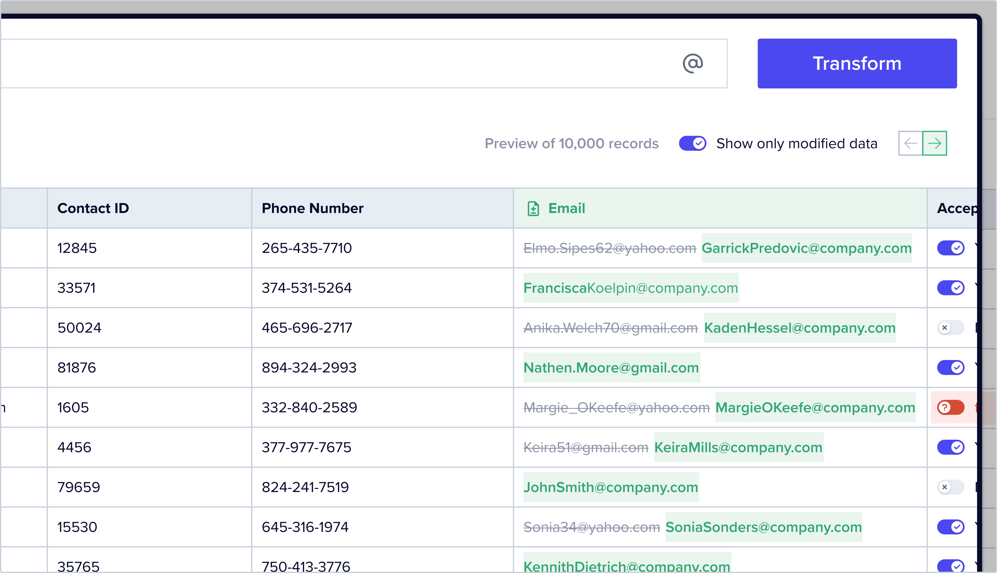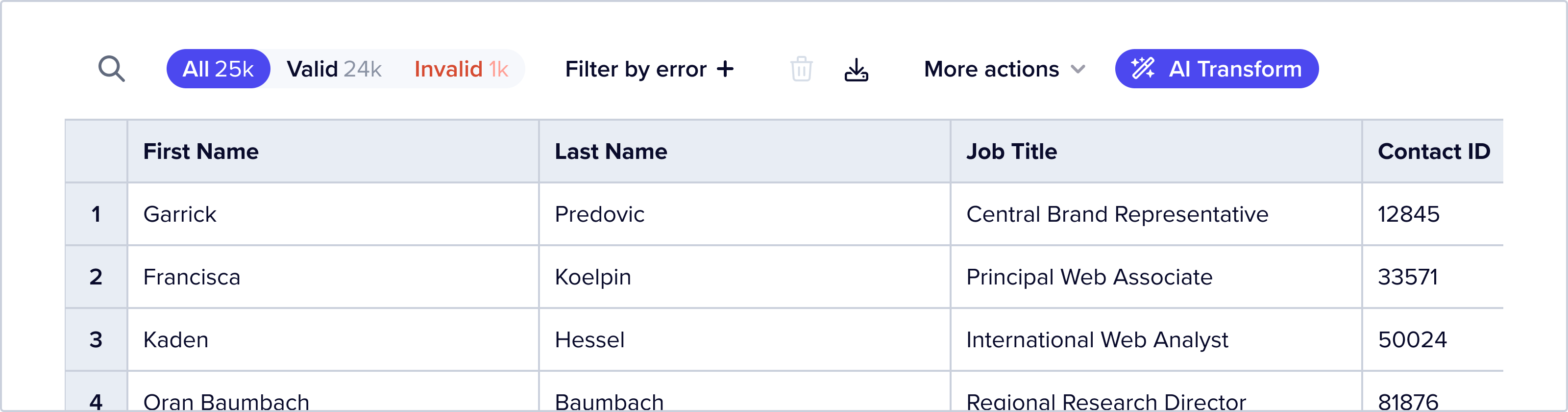 Users can also use Flatfile’s AI Transform feature and to describe how they’d like their data transformed using natural language. Flatfile takes this prompt and generates and executes the code necessary to make the desired changes instantly across the entire data set.