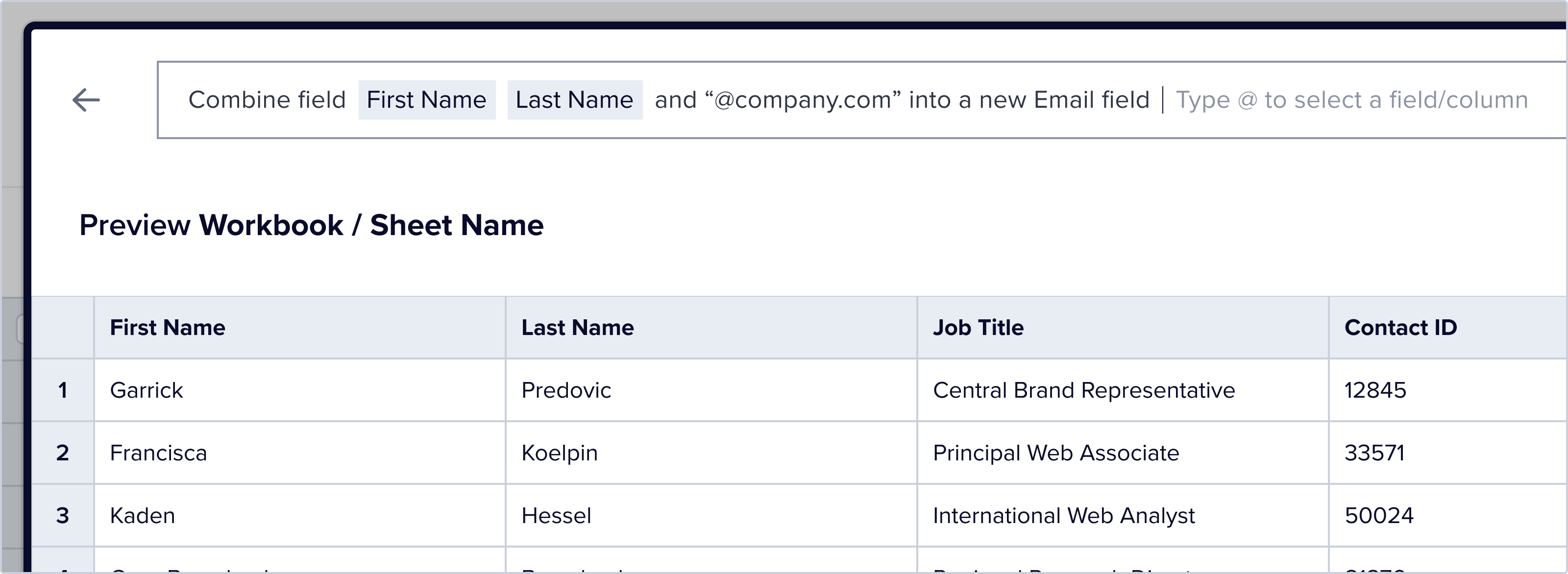 For example, if you know that your customers often bring in a column that contains full names but your blueprint wants a First Name and Last Name in two separate columns you can configure a “Name Splitter” action that detects if either of your configured blueprint fields, “First Name” or “Last Name” contain a full name, and if so, to split the name and place the first name in the “First Name” field and the “Last Name” in the last name field.