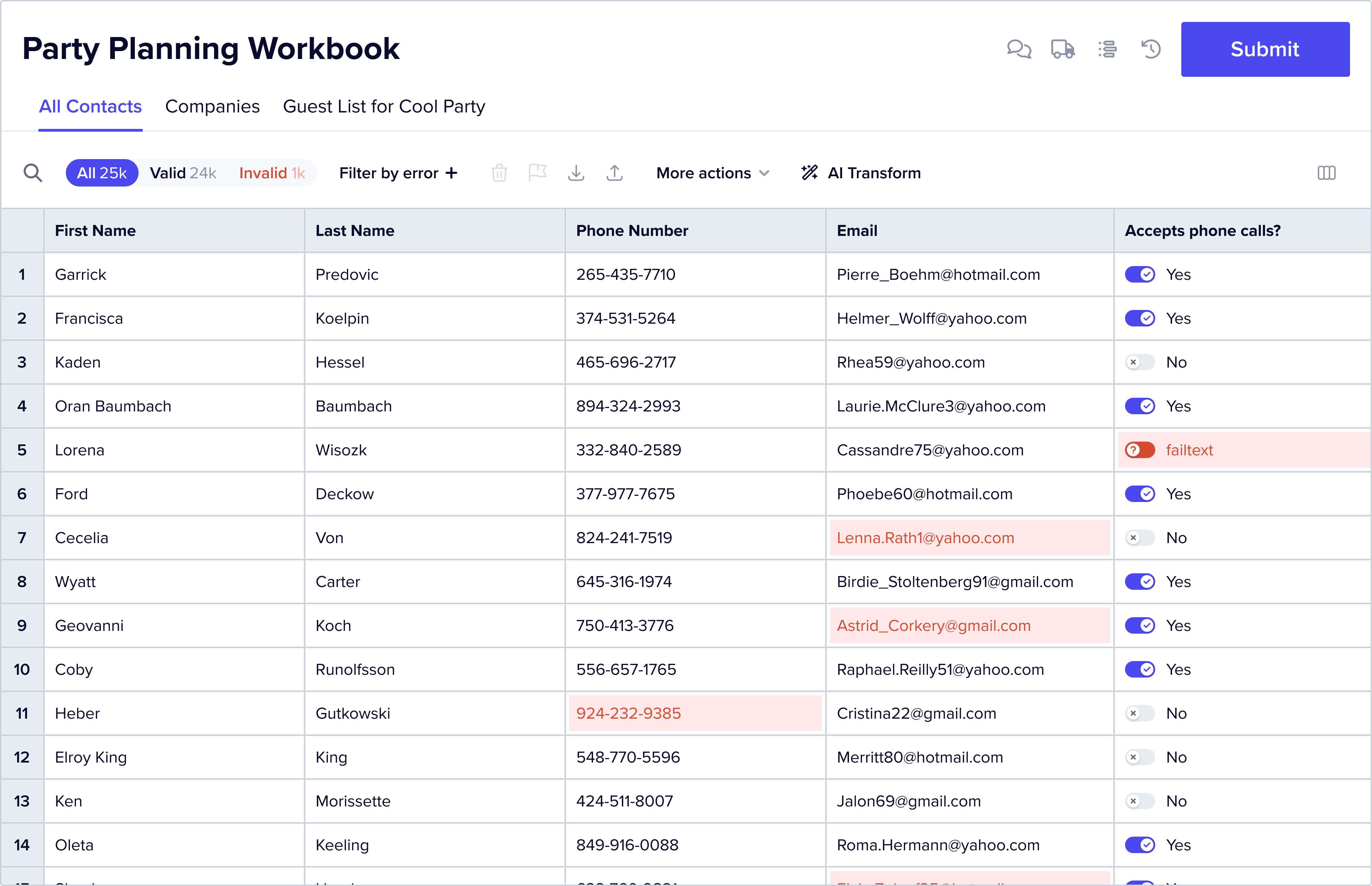 After transforming the data the end user can review and correct any errors they see (e.g. guests with invalid emails or similar). Turntable – the topic of this blog post – is the user interface provided by Flatfile for data review and error resolution.